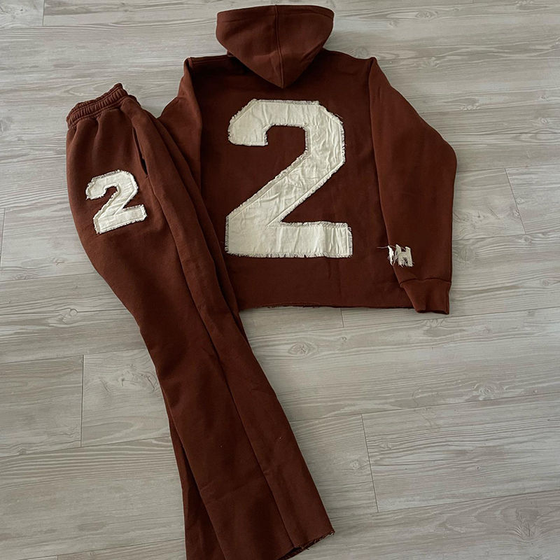 Custom Applique Embroidery Acid Wash Man Flared Sweatpants and Hoodie Set for Men Heavyweight Distressed Zip up Men's Tracksuit