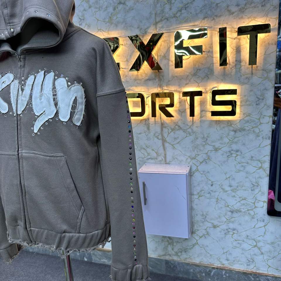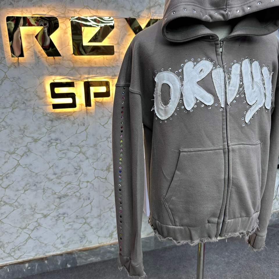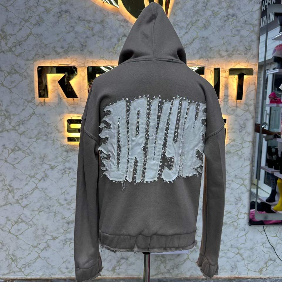 Custom Applique Embroidery Distressed Hoodie Rhinestone Zip up Jacket Acid Wash Vintage Washed Men Fleece Streetwear Hoodie