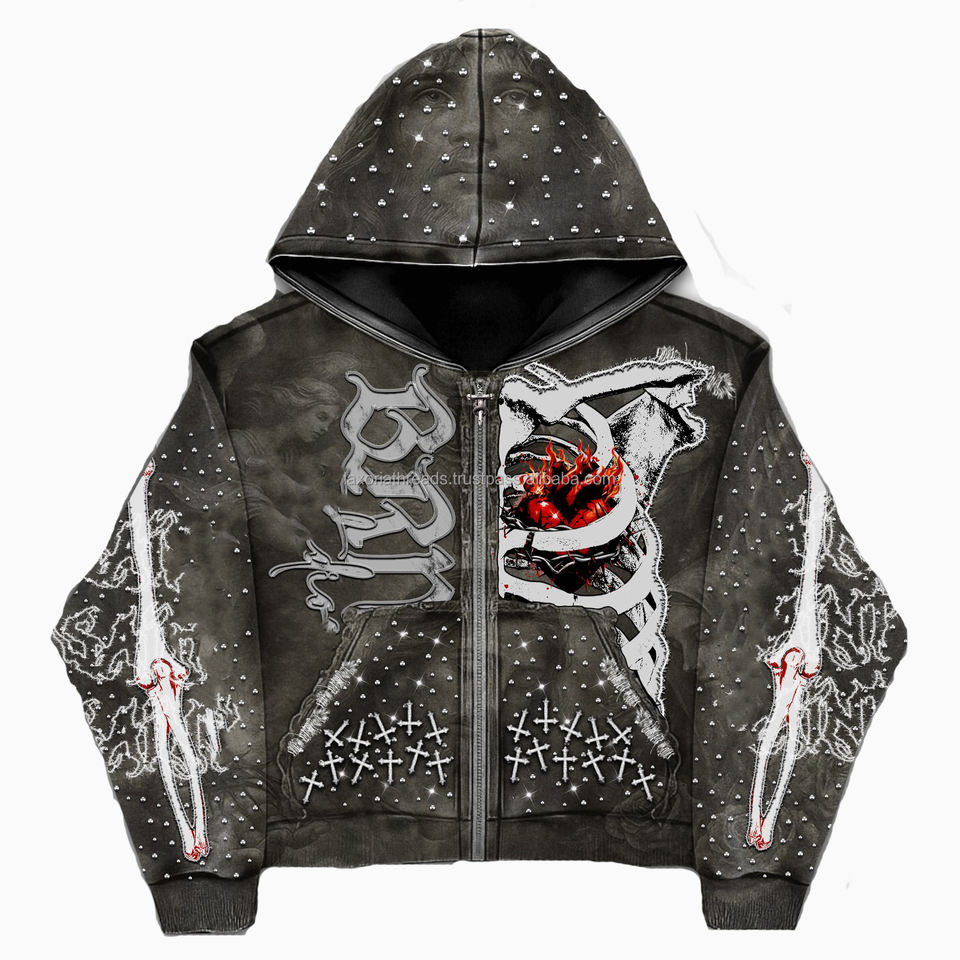 Custom Applique Embroidery Distressed Hoodie Rhinestone Zip up Hoodies Acid Washed Vintage Wash Men Streetwear Hoodie