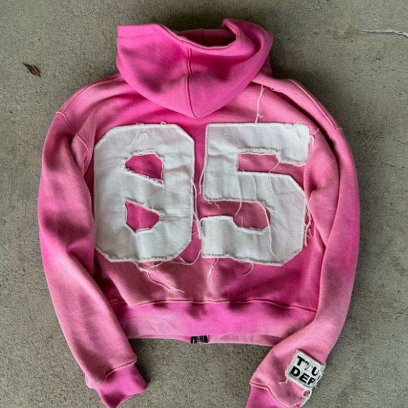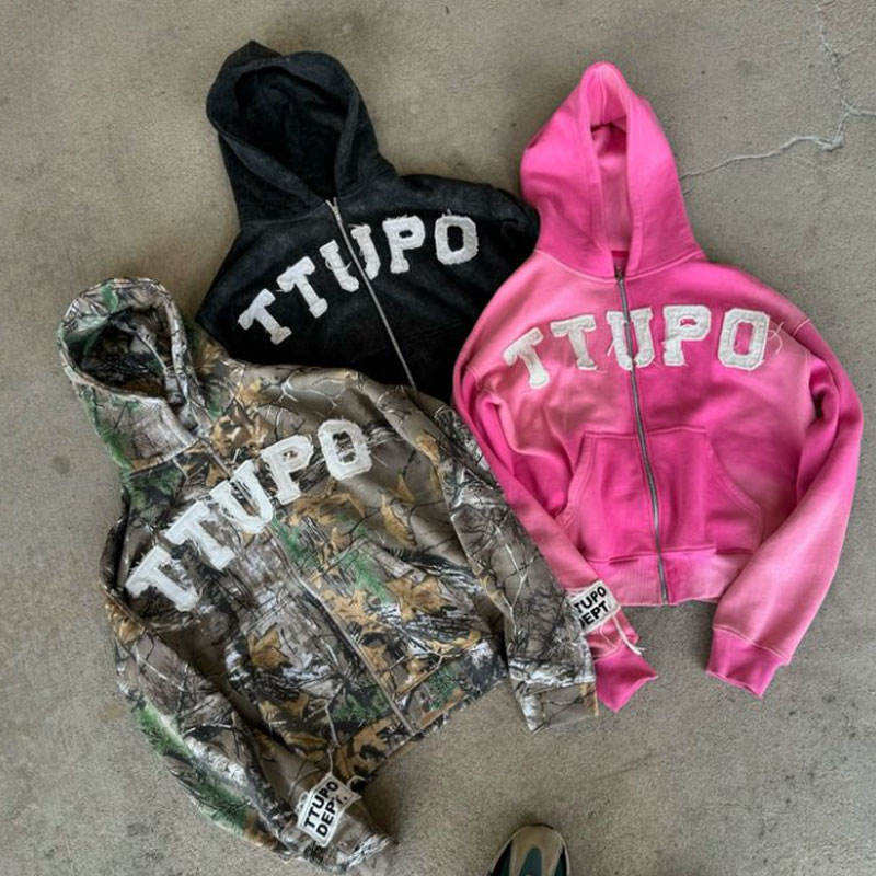 Custom Applique Embroidery Distressed Rhinestone Zip up Jacket Acid Wash Vintage Wash Men Fleece Streetwear Hoodie for Men