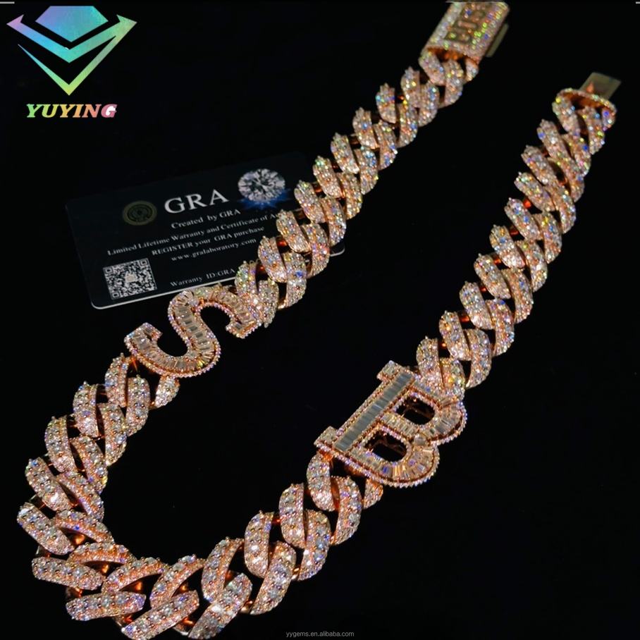 Custom Baguette Letter Charms Hip Hop 23MM 25MM Full Iced Out Raised Moissanite Chain S925 Rose Gold Heavy Cuban Chain Necklace