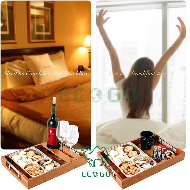 Custom Eco-Friendly Rectangle Bamboo Snack Bar Sofa Bed Caddy Tray Multipurpose Wine Drink Cup Holder Food Storage Box Couch Bar