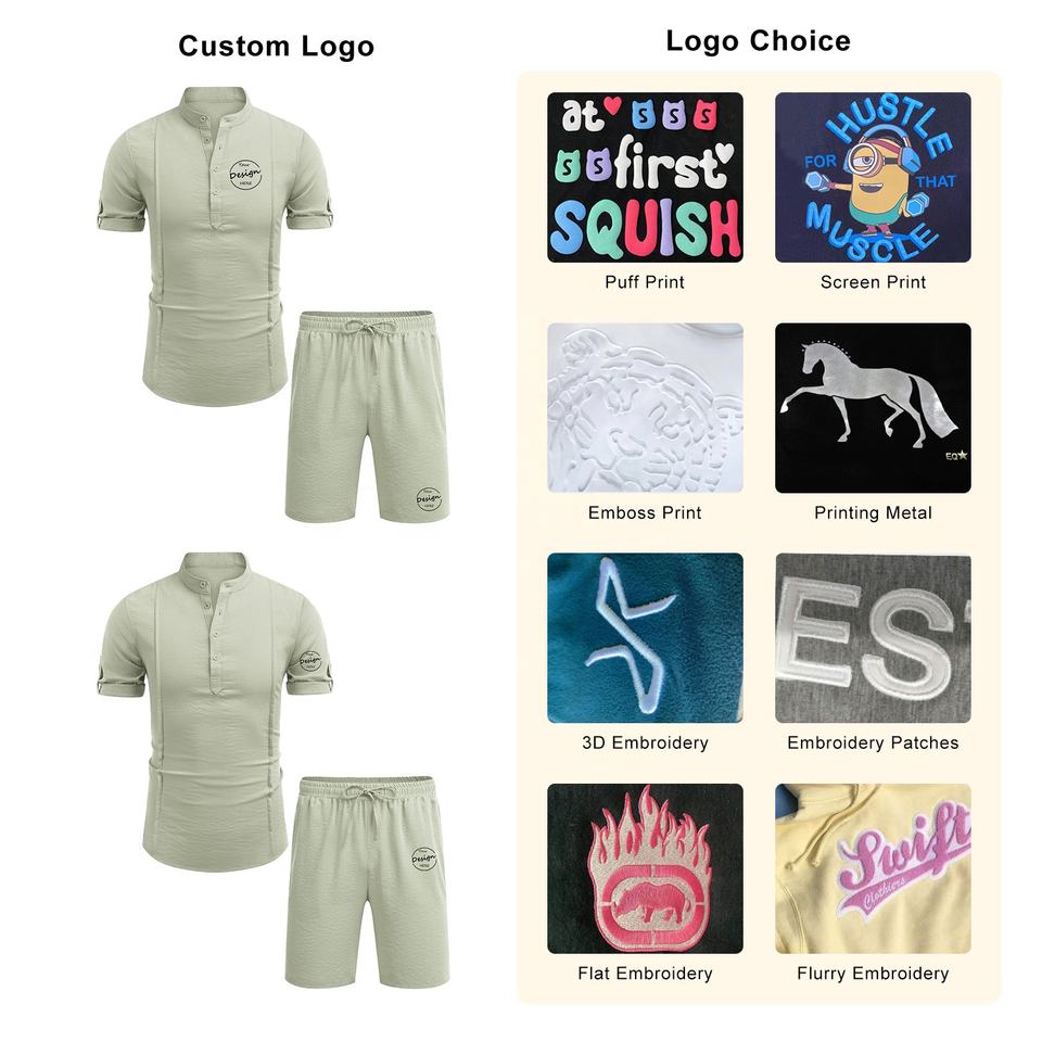 Custom Band Collar Half Open Buckle Shirt Elastic Waist Side Pockets Shorts Suit High Quality Soft Breathable 100 Linen Set Men