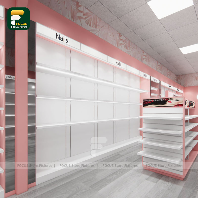 Custom Beauty Store Interior Design Pink Cosmetic Display Shelf Skincare Haircare Product Gondola Shelving Makeup Store Fixture