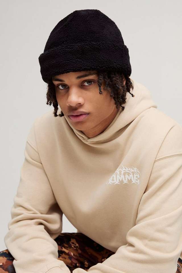 Custom Black Borg Fleece Beanie Hat Men Women Warm Winter Streetwear Thick Soft Teddy Fabric Folded Knit Skull Cap 3D Embroidery