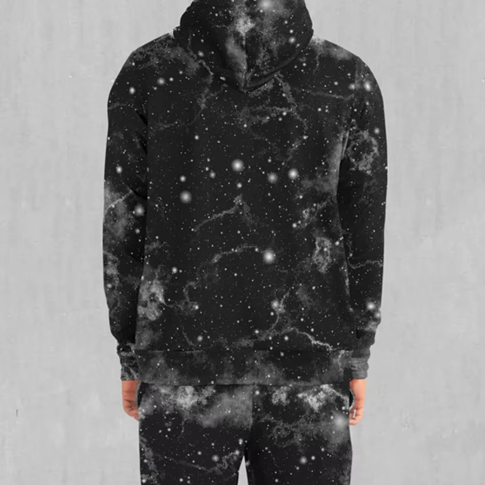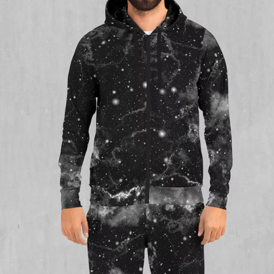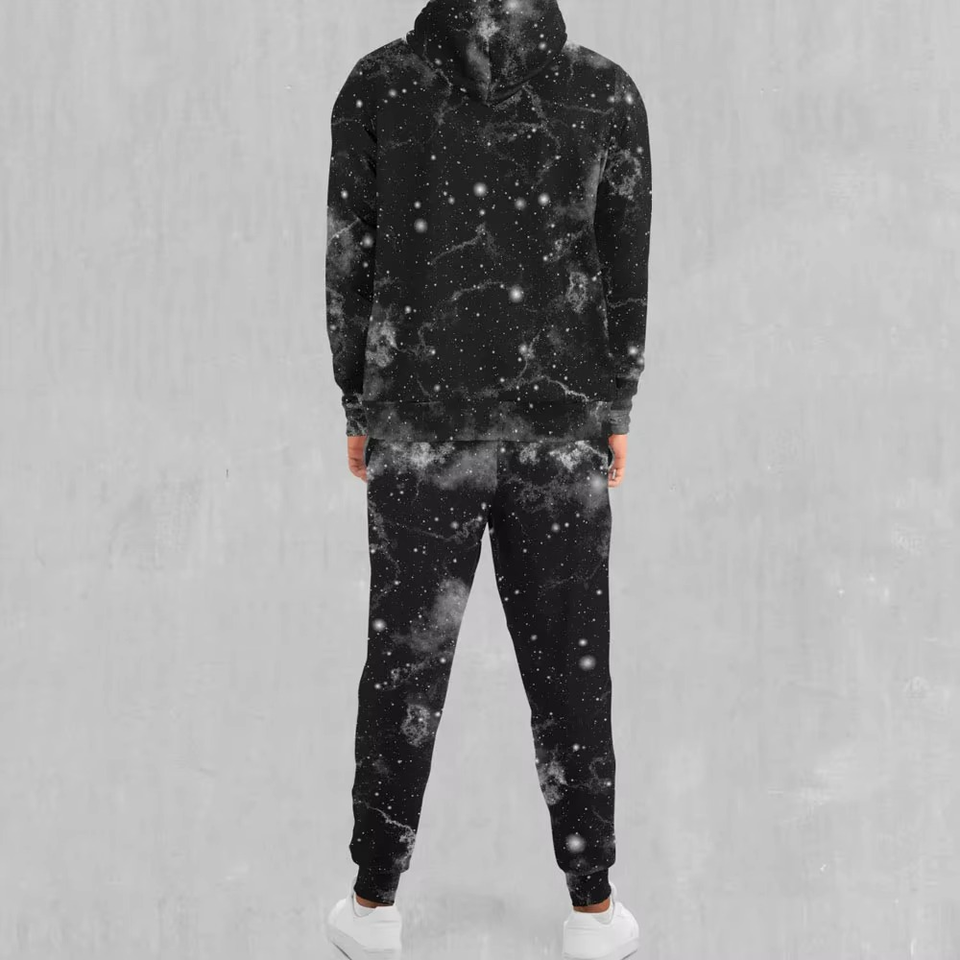 Custom Black Galaxy Print Tracksuit Set Unisex Zip Up Hoodie and Jogger Pants Two Piece Outfit Fashion Streetwear