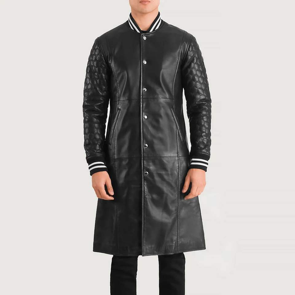 Custom Black Leather Varsity Coat for Men Stand Collar Casual Winter Style with Front Logo Closure OEM Service Available