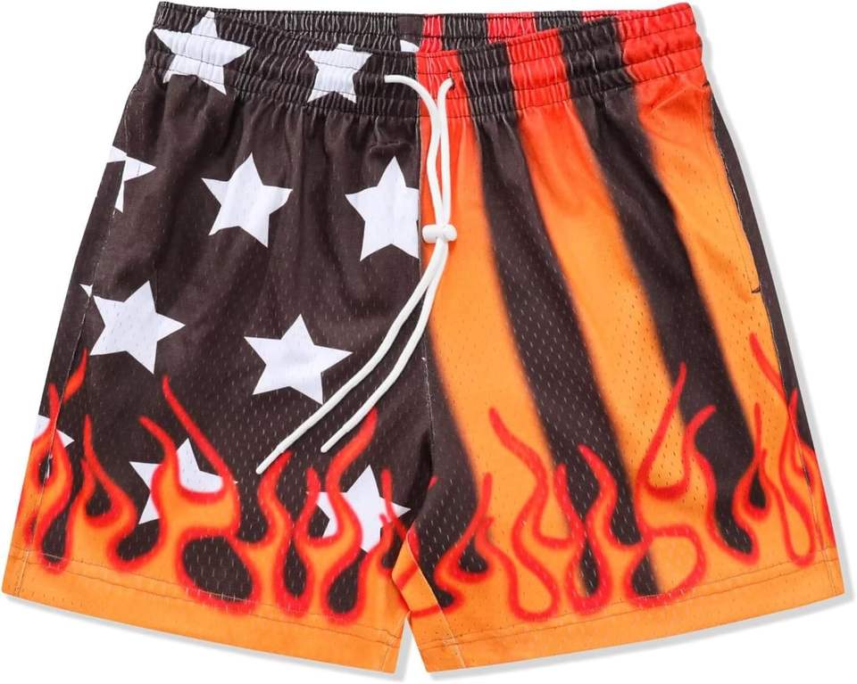 Custom Black Orange Anti-Bacterial Unisex Basketball Shorts with Star and Flame Print Mesh Fabric Elastic Waist Drawstring