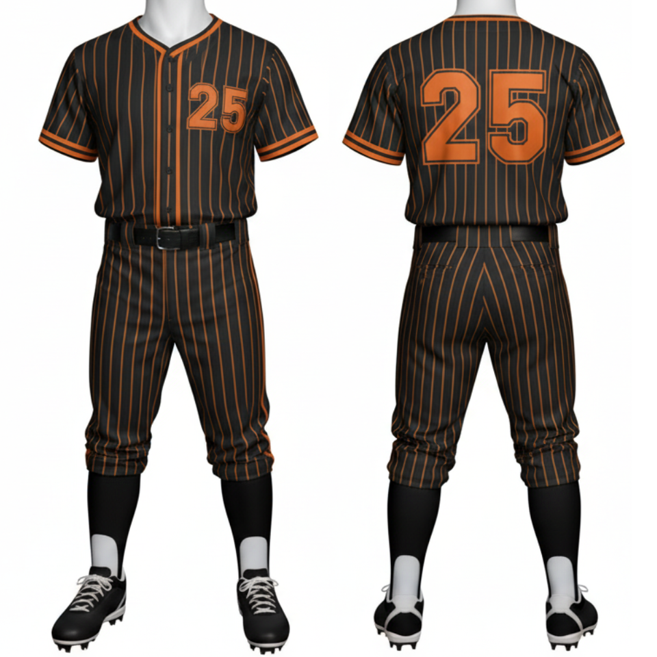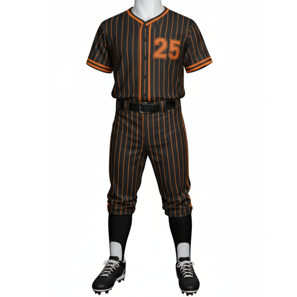 Custom Black & Orange Pinstripe Baseball Uniform Set Full Sublimation Team Jersey with Traditional Front and Matching Pant