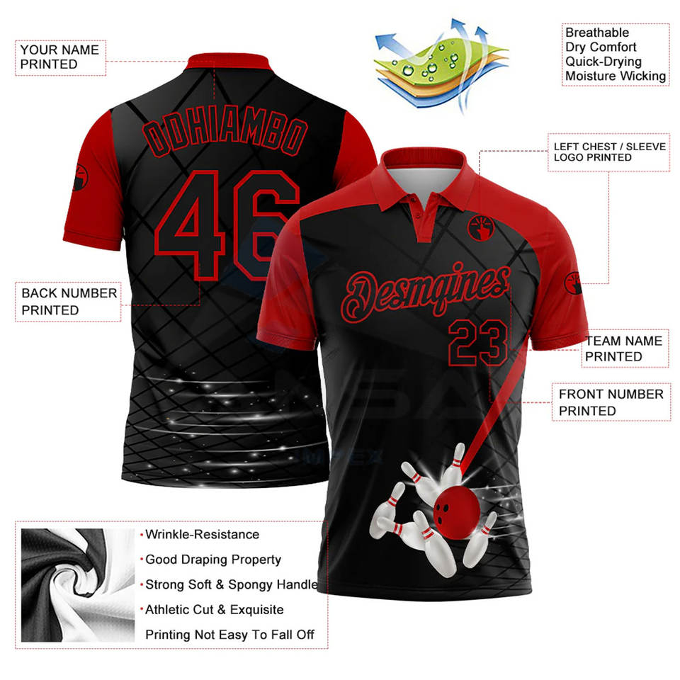 Custom Black Red 3D Pattern Design Bowling Performance Polo Shirt Breathable Moisture-Wicking Athletic Polo