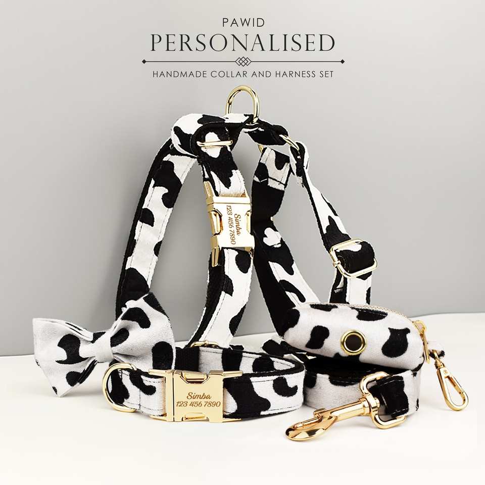 Custom Black White Cow Pattern Velvet Personalized Collar, Matching Bowtie, Leash, Roman Harness & Dog Poop Bag, Different Combo