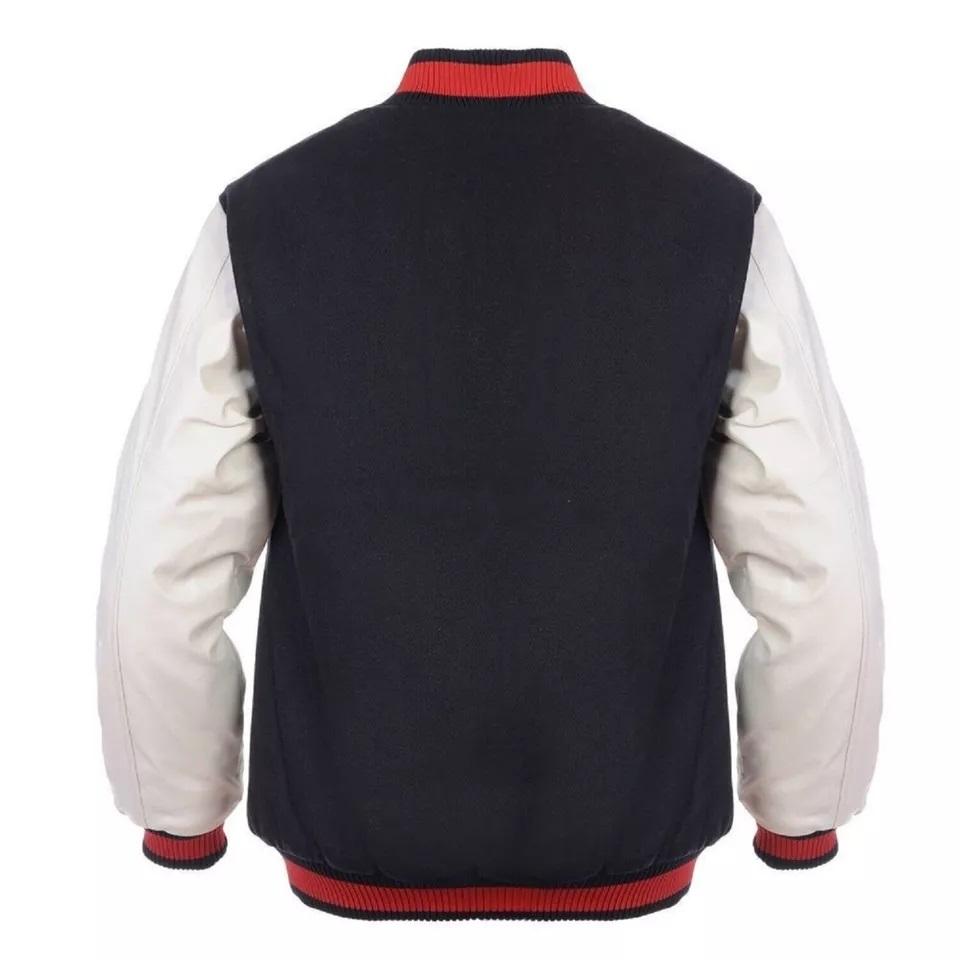 Custom Black Wool Varsity College Bomber Baseball Jacket White Leather Arms Stand Collar High Street Style Windproof Breathable