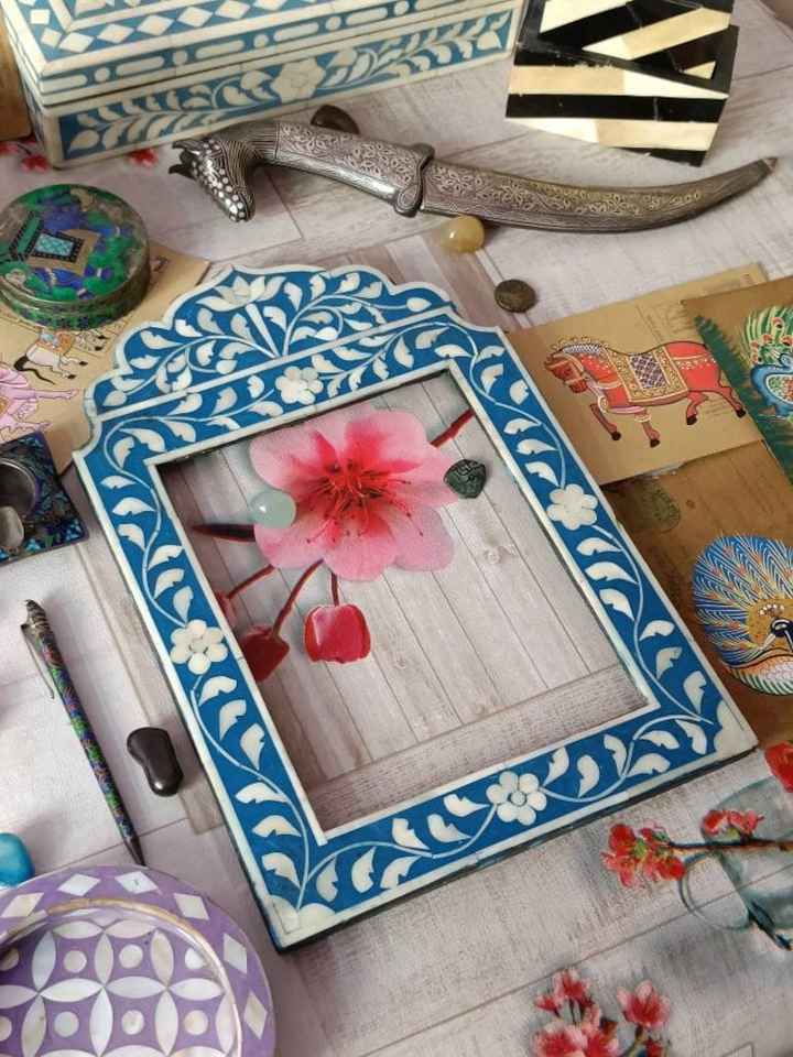 Custom Blue Metal Photo Frame with Indian Square Pattern & Curving Design Bone Inspired Picture Frame Available in All Sizes