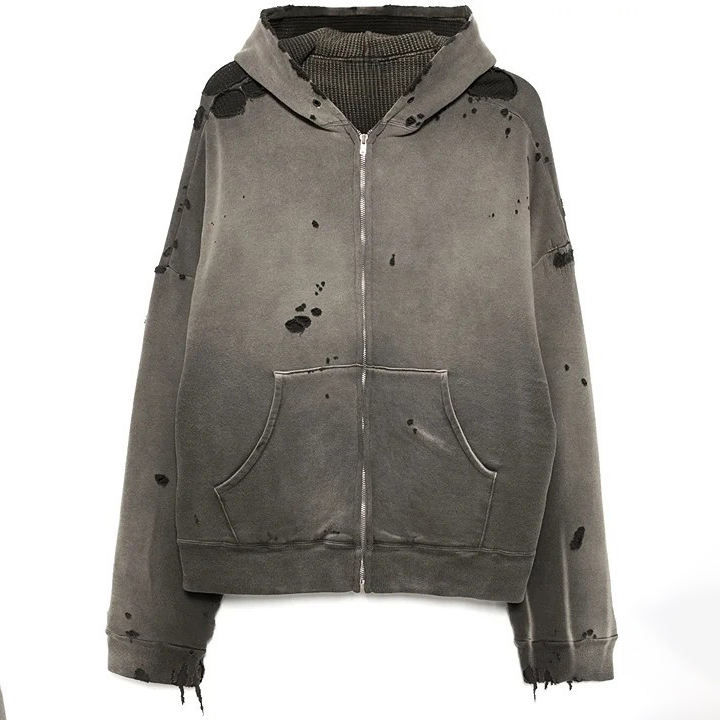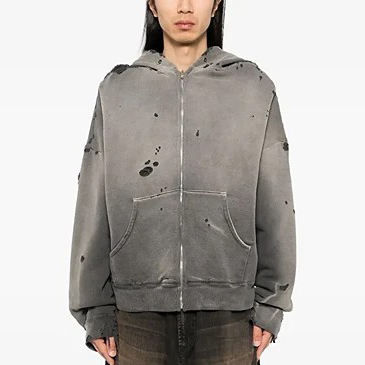 Custom Boxy Fit 500 Gsm Heavyweight Men Washed Hoodie Vintage Distressed Cropped Acid Wash Zip Up Hoodies