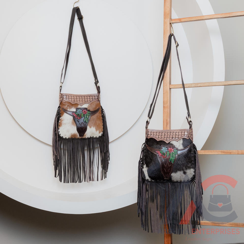 Custom Branded Hair on & Tooled Leather Women Crossbody Purse Western Cowgirl Style Cowhide Fringe Purse Genuine Leather Purse