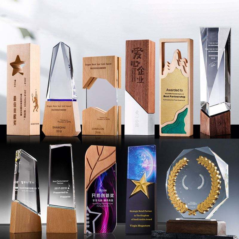 Custom Business Gift Solid Momentoes Metal Crystal Glass Acrylic Award Trophy Blank With Wooden Base Crystal Trophy