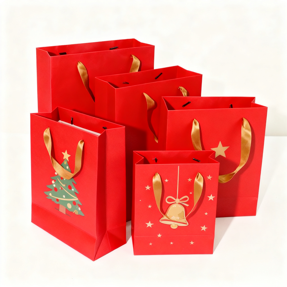 Custom Christmas Kraft Paper Gift Bags Festive Printed Tote Bags with Ribbon Eco-Friendly Recyclable Gift Packaging Bag