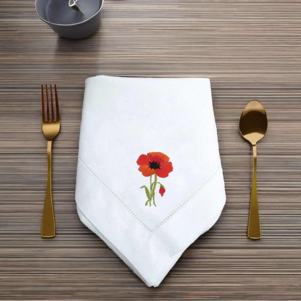 Custom Cloth Napkin Embroidered Red Poppy Flowers Dinner Napkin Cotton Hemstitch Table Napkins Home Hotel Wedding Gifts