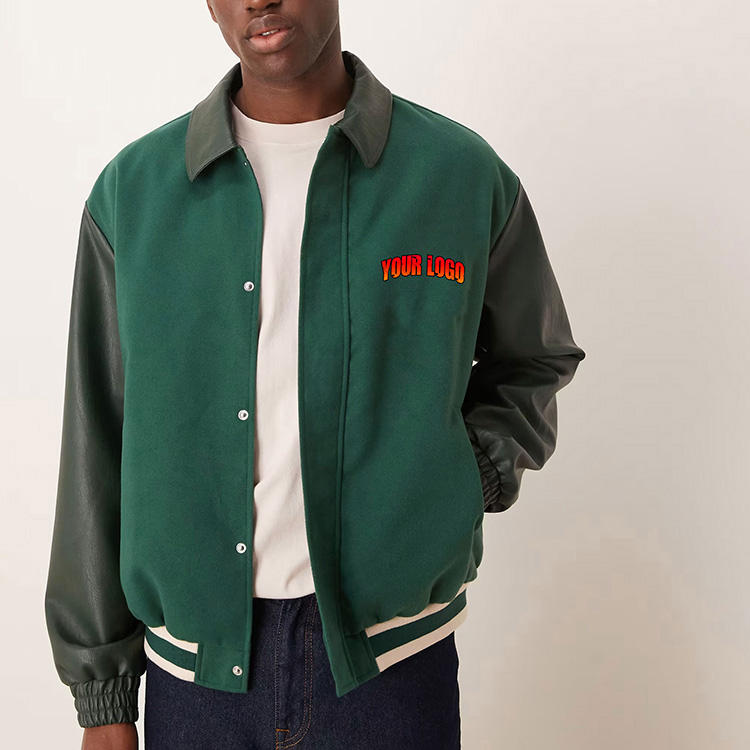 Custom Clothing Manufacturers Custom Cow Hide Leather Sleeve Stand Embroidery Front Streetwear Letterman Varsity Jacket for Men