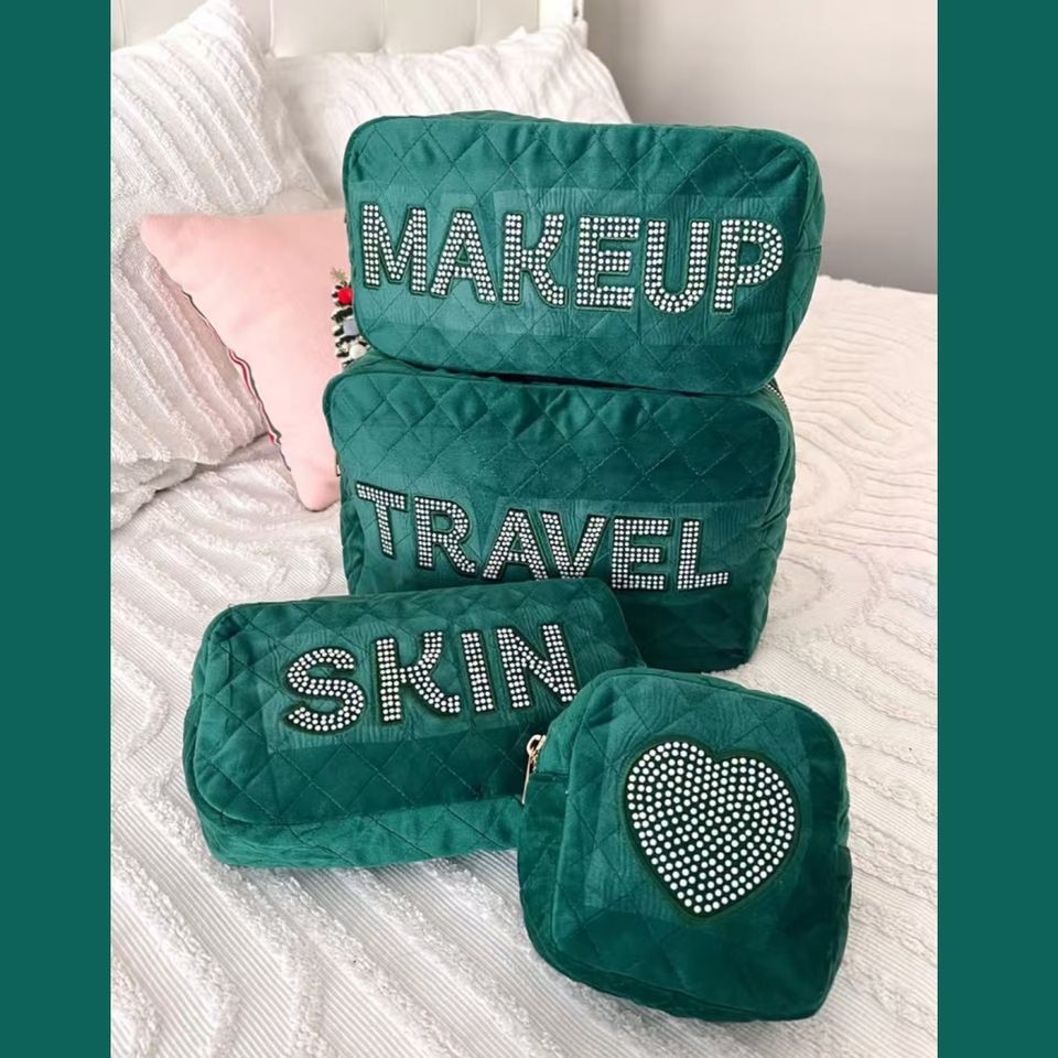 Custom Color Green Silk Velvet Quilted for Toiletry Bag Set 4 Sizes Hot Stamp Crystal Stamp Custom Makeup Bag for Travel Use