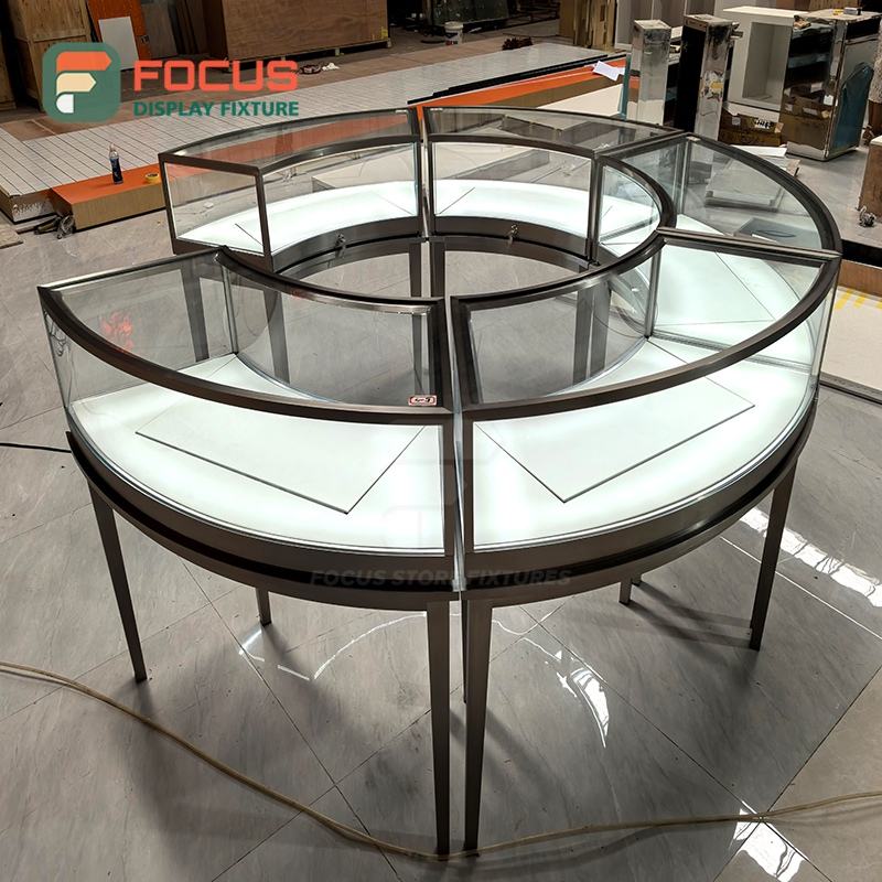 Custom Curved Glass Island Display Counter Round Modular Showcase Cabinet Metal Frame Retail Fixture