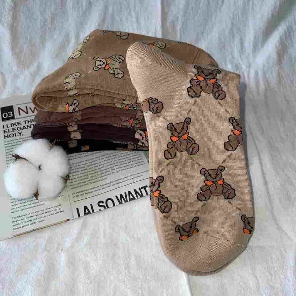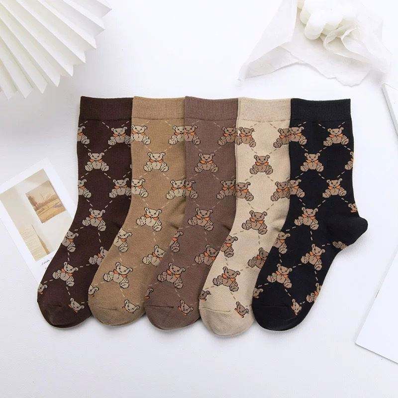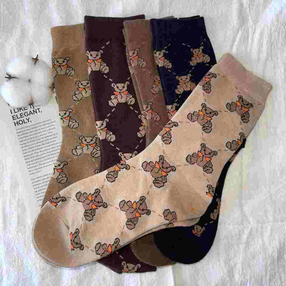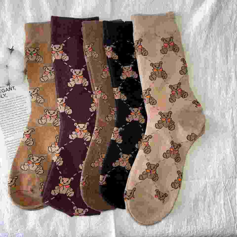 Bear Pattern Socks Women Korean Student Socks Girl Wearing Crew Socks