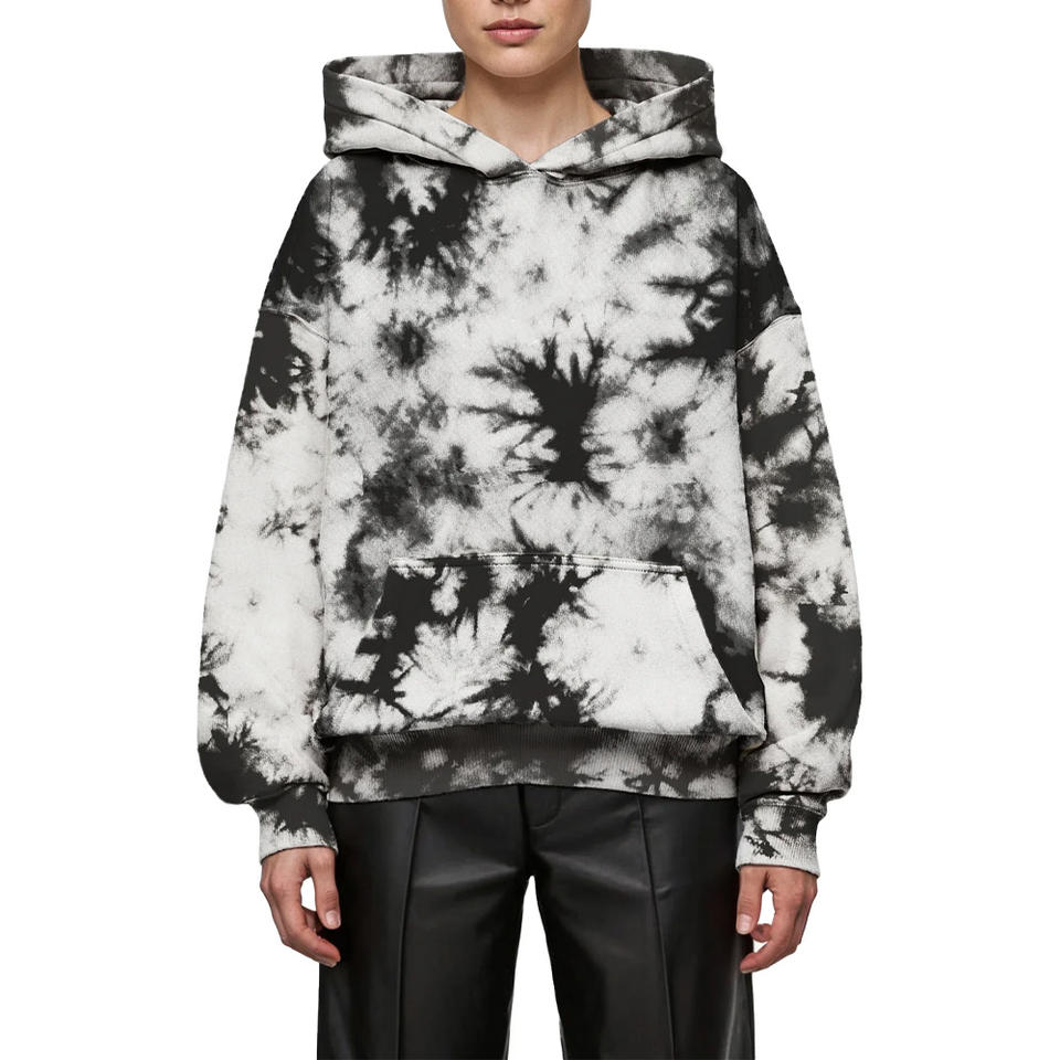 Custom Design Hoodie Men's Pullover Basics Front Pocket Winter Black White Tie-Dyed Cotton Blended Bleach Washed Print