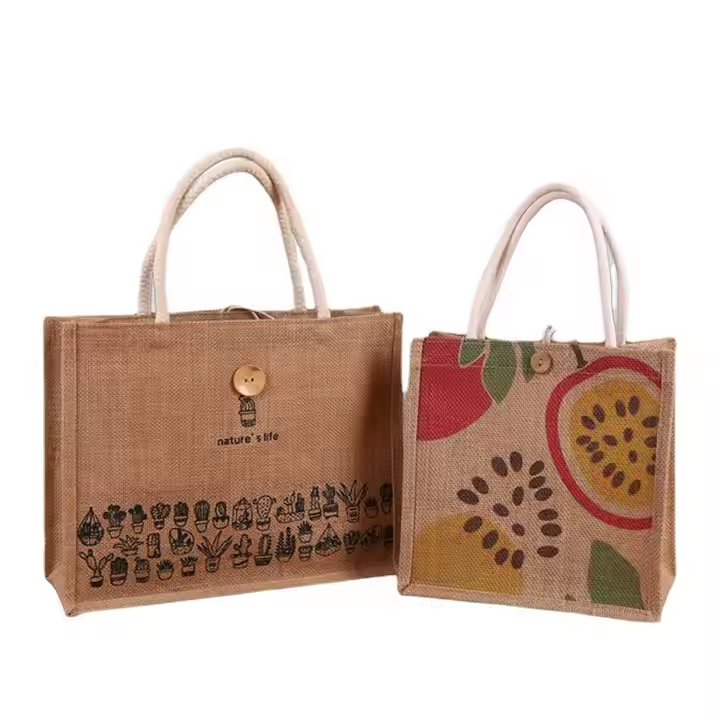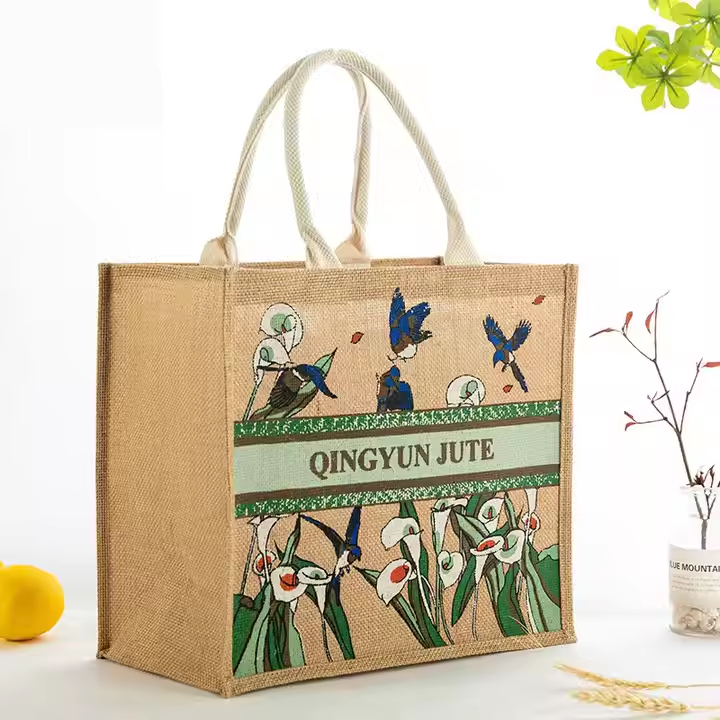 Medium Floral Printed Jute Drawstring Bag Recyclable Canvas Leather Beach Bag with Rope Handle for Daily Use Wine Bottle Storage