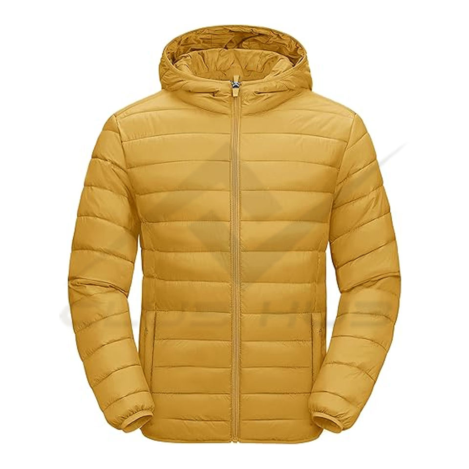 Custom Design outdoor Sports Lightweight Yellow Bubble Jacket with Hood Water Resistant Outerwear Manufacturer In Pakistan