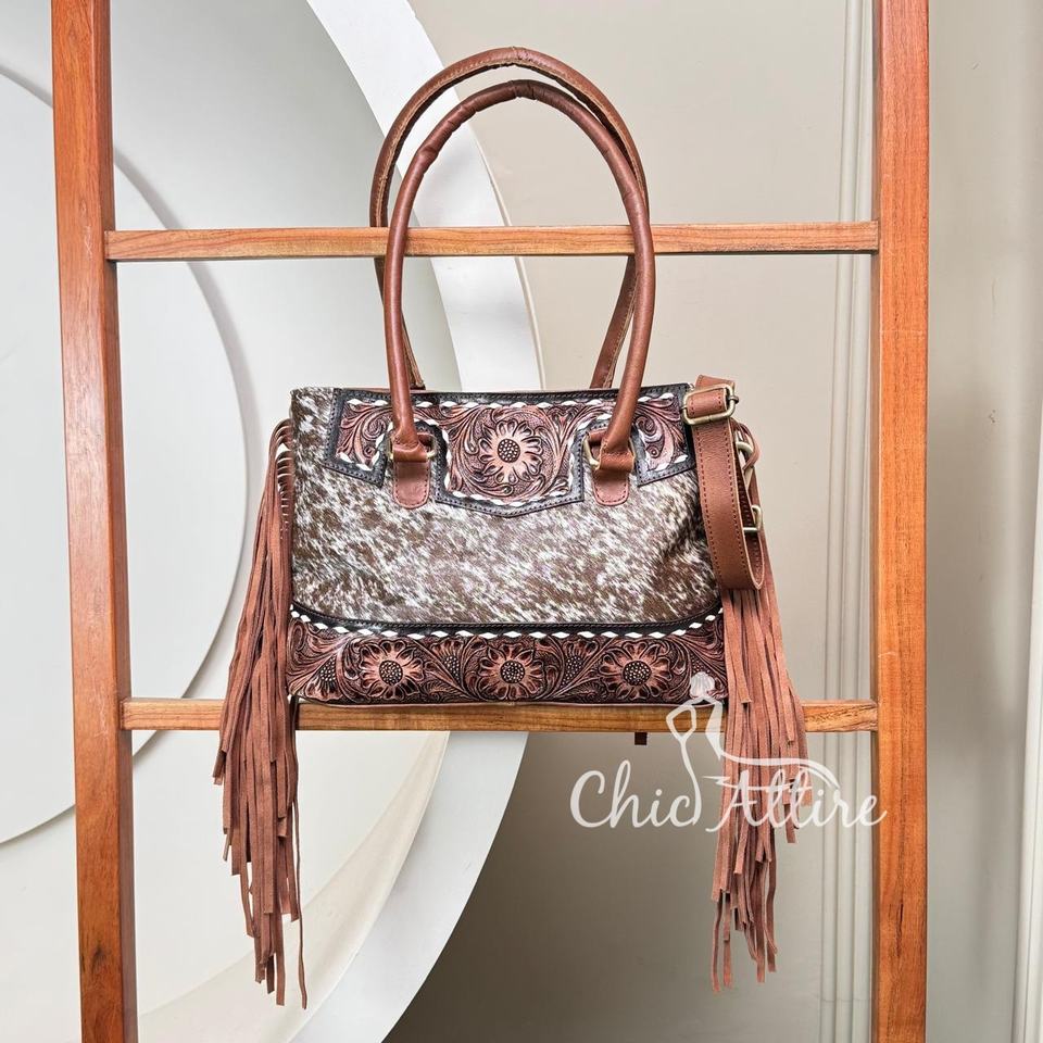 Product name:Hand Tooled Cowhide Leather Fringe Tote Bag