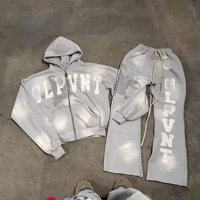 Custom Distressed Acid Wash Zip up Vintage Tracksuits Applique Embroidered Patch 400GSM Terry Hoodie and Sweatpants Set for Men