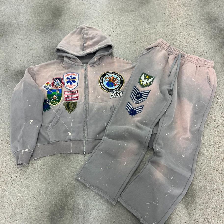 Custom Distressed Embroidery Patch Hoodie Acid Wash Boxy Fit Vintage Zip Men's Cotton Sweatpants & Jogger Tracksuit Set