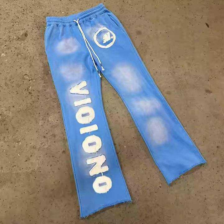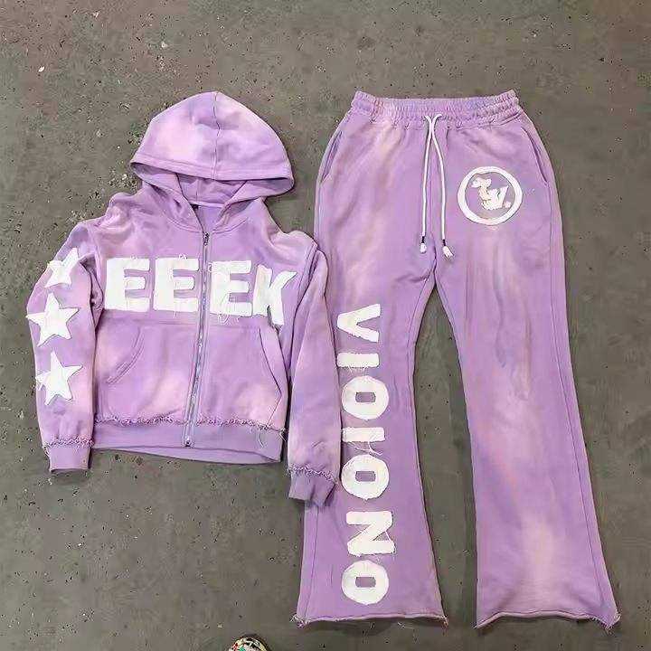 Custom Distressed Patchwork Men's Sweatsuit Zip up Hoodie Flared Pants Tracksuit men Acid Washed Sweatpants and Hoodie Set