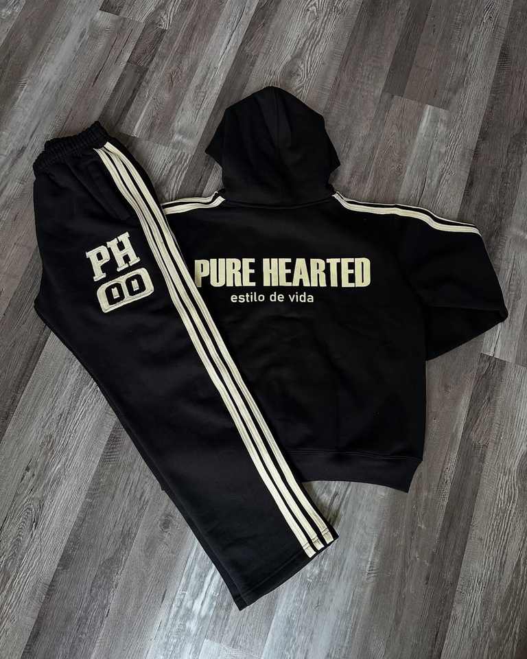 Custom Distressed Print Hoodie And Sweatpants Sets Cotton Streetwear Tracksuits With Side Stripe For Winter Loose Sweatsuit Set