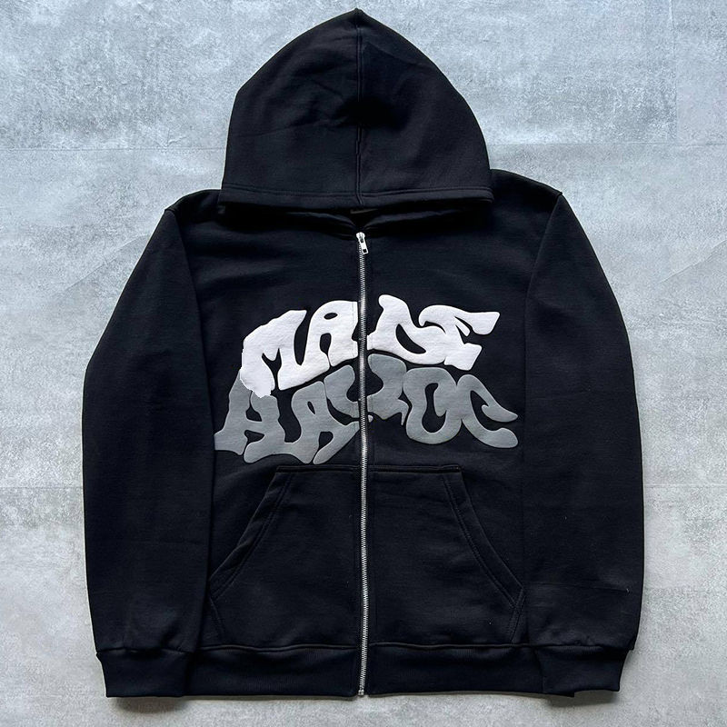 Custom Distressed Thermal Hoodie for Men Oversized Zip-up for Puff Print Boxy Cropped Pullover Rhinestone Hem Acid Wash for
