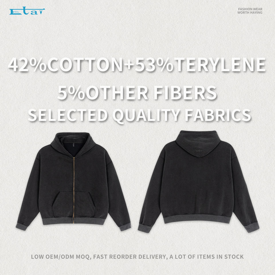 Custom Double Layer Hood Black Vintage Zip up Hoodie Drop Shoulder Boxy Oversized Acid Wash Hoodies for Men