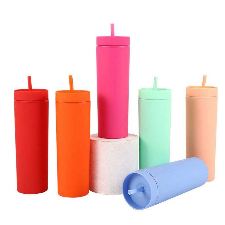 Custom Double Wall Reusable Water Coffee Mug 16Oz Acrylic Plastic Matte Skinny Tumbler Cups in Bulk With Lid and Straw