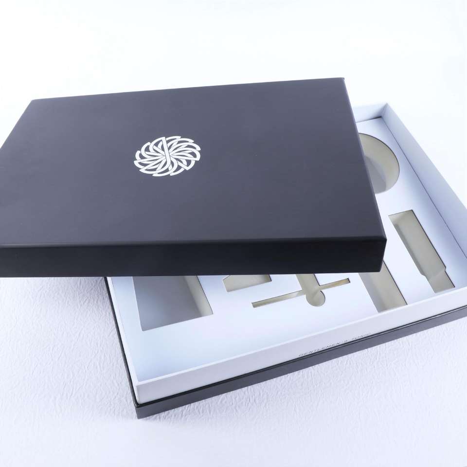 Custom Eco Friendly Black Paper Card Lip and Base Boxes for Cosmetics Perfume Cream Facial Packaging Box with Stamping Silver