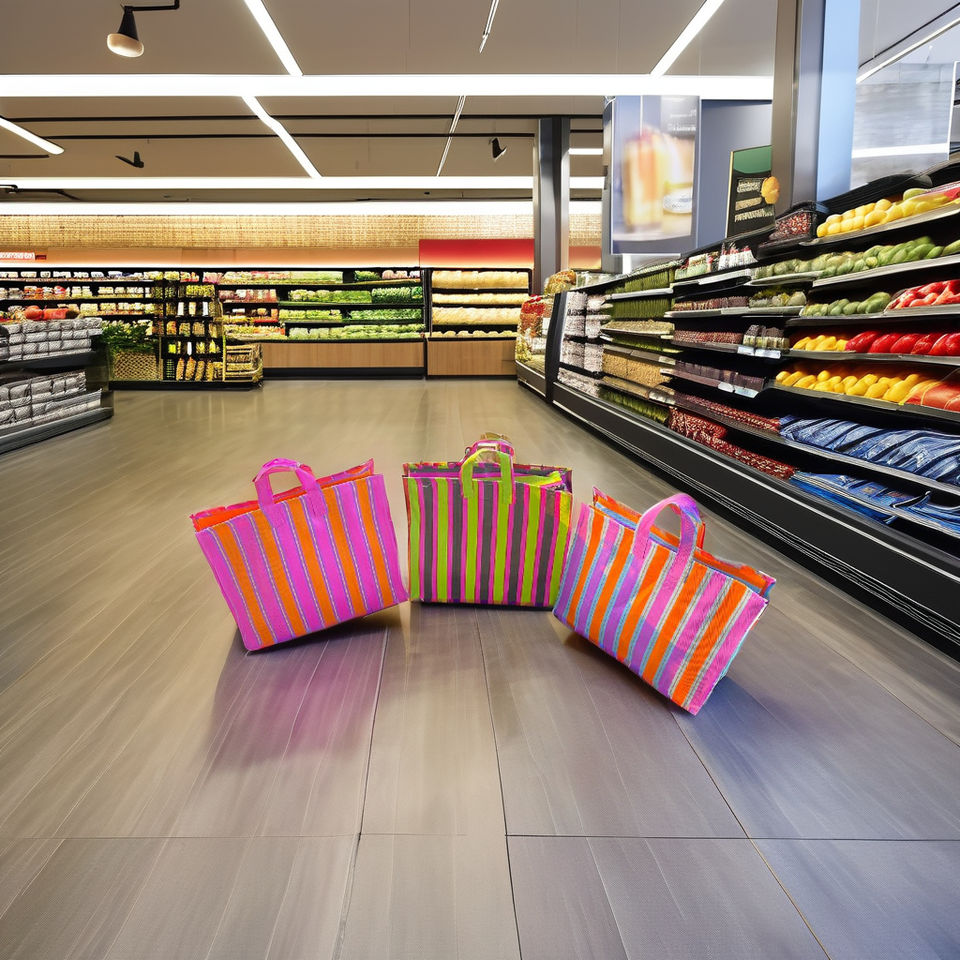 Custom Eco-Friendly Fashion Reusable Zipper Plastic Woven Striped Shopping Bag Handloom Made Recycled Nylon Beach Bags Cosmetic