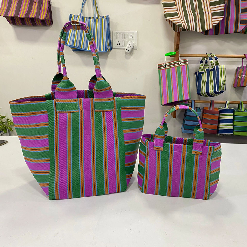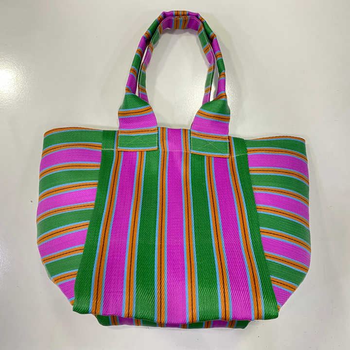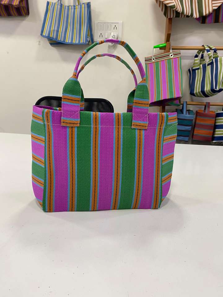 Custom Eco-Friendly Large Capacity Reusable Zipper Plastic Woven Striped Shopping Bag Handloom Made Recycled Beach Cosmetic