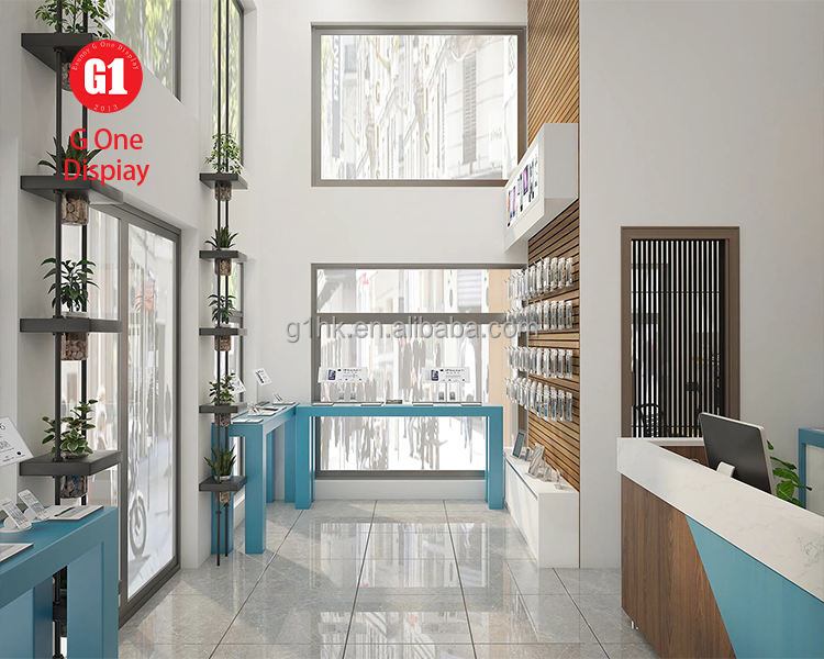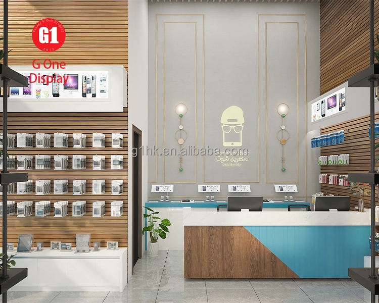 Custom Eco-Friendly Wooden LED-Lit Mobile Phone Store Display Stands with Modern Retail Phone Shop Design