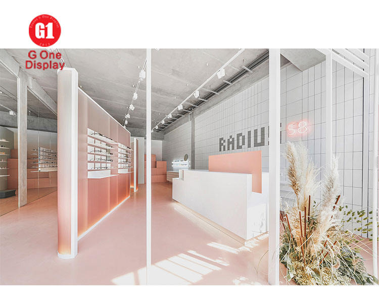 Custom Elegant Display Stand Wooden Optical Store Island Counter with LED Lighting Eyewear Shop Design with Multi-Level Shelving