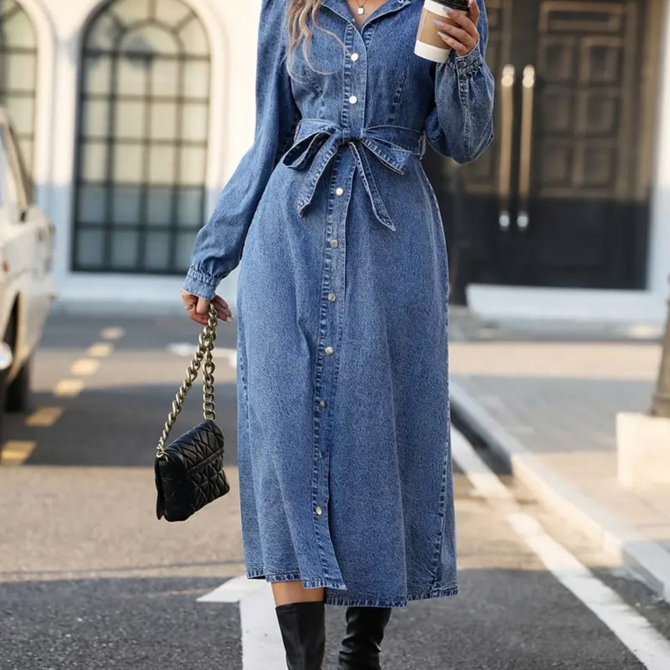 Style:Vintage, Lapel Neckline Denim Midi Dress For Women
