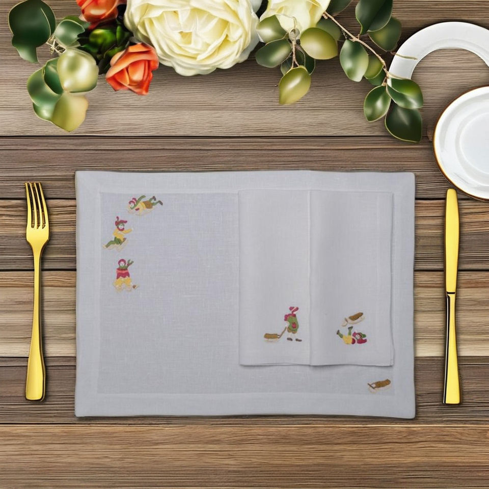 Custom Embroidered Grass Skating Design Placemat and Napkin Sets White Linen Washable Mats for Weddings Home Hotel Events