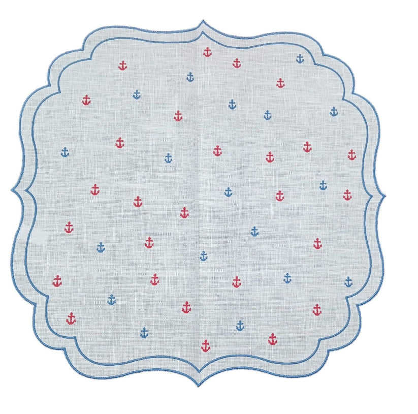 Custom Embroidery Anchor Design Placemat&Napkin Set for Home Restaurant Wedding White Linen Scalloped Border Placemat&Napki