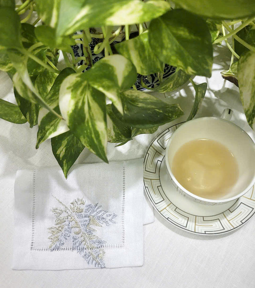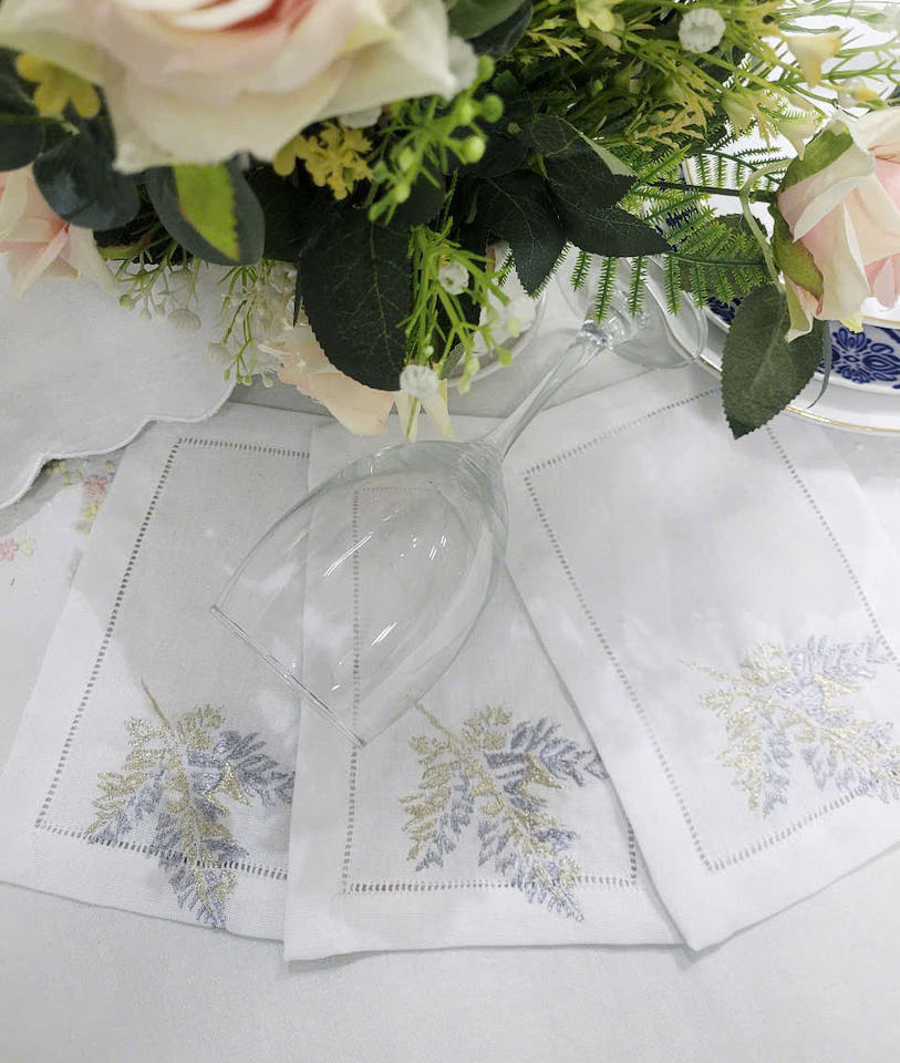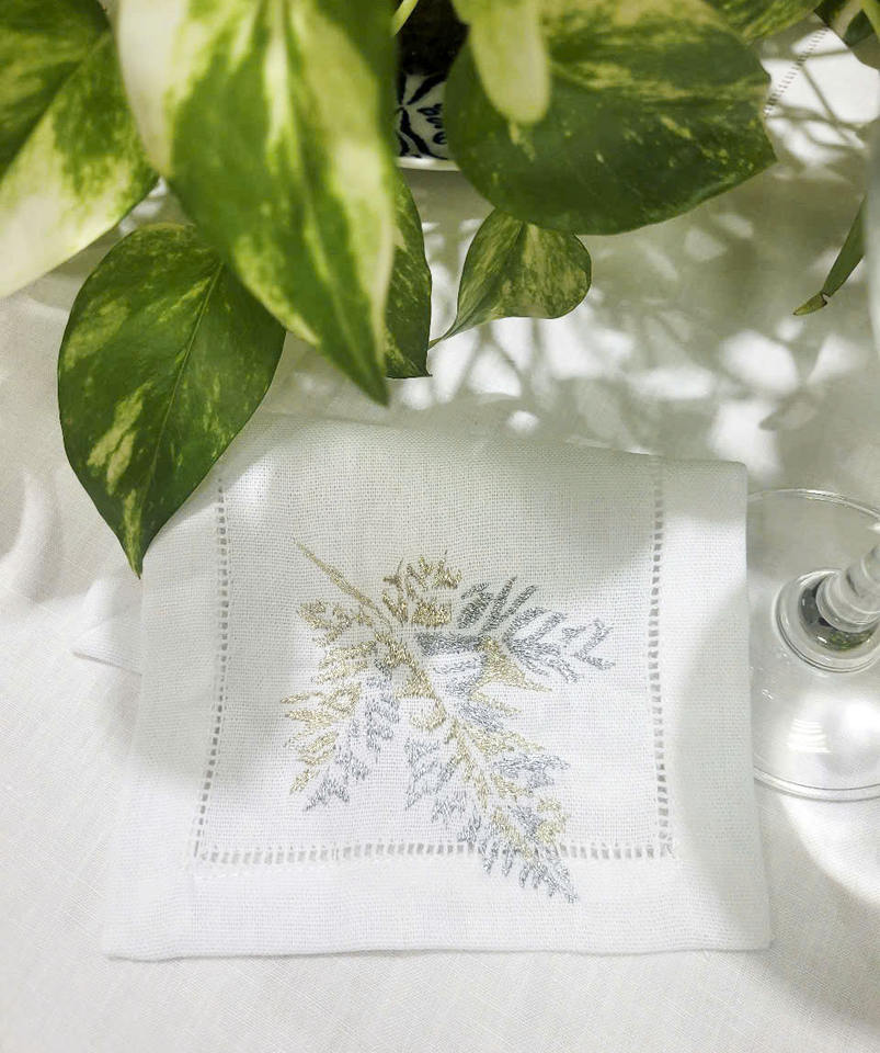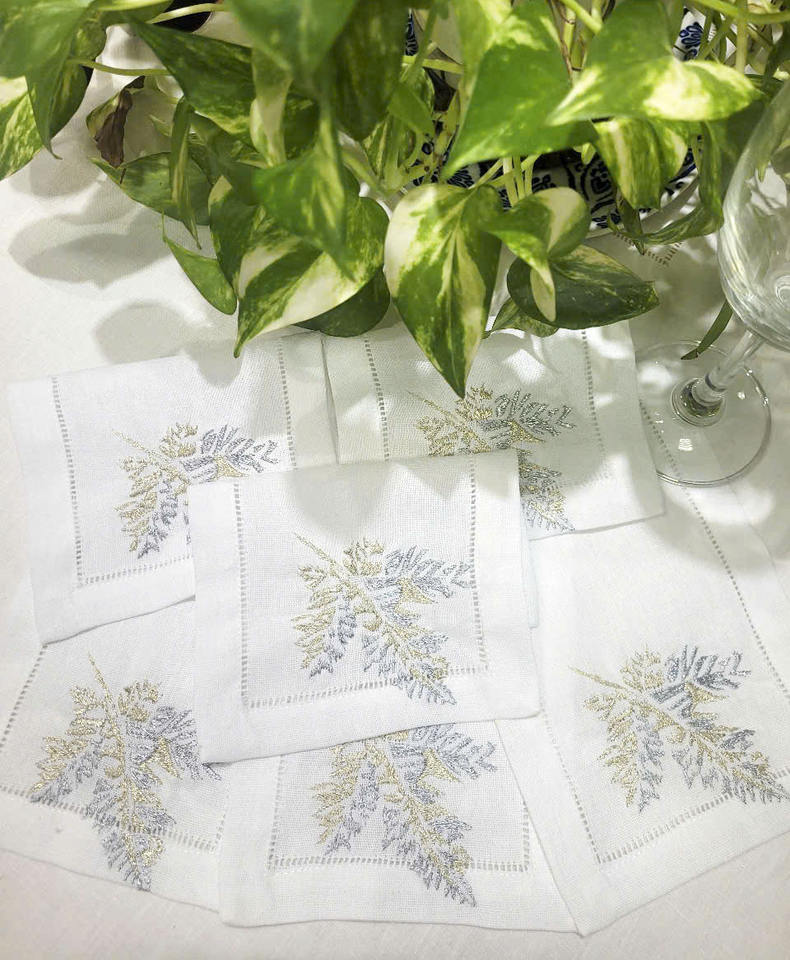 Custom Embroidery Gold and Silver Leaf Fold Cocktail Napkins 6x9" Cotton Linen Blend Hemstitch Beverage Napkin for Home Hotel