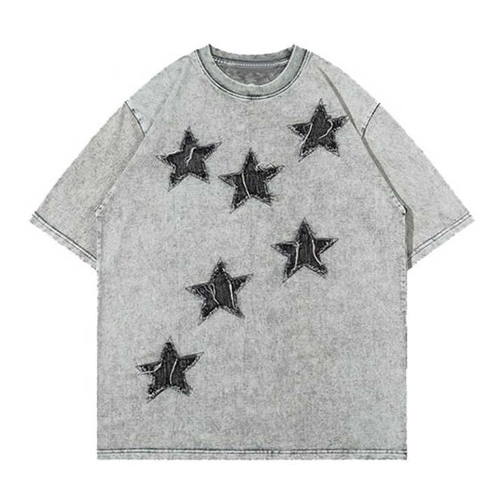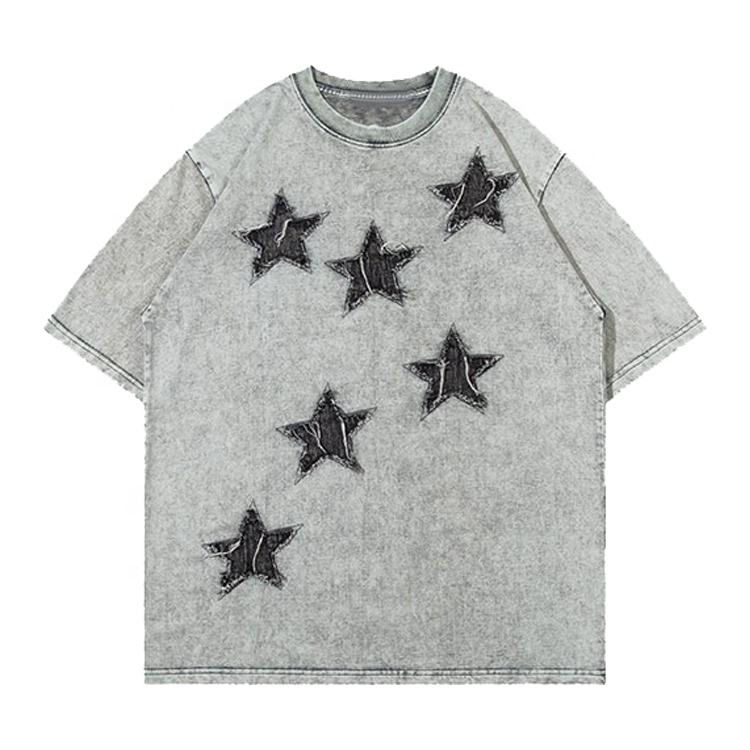 Custom Embroidery Logo 100% Cotton Acid Washed Oversized Star Patches Distressed T-Shirts for Men's Wear Quick Dry Eco-Friendly