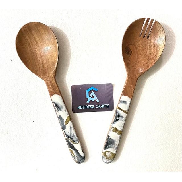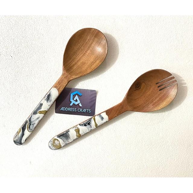 Custom Engraved Logo Dessert Salad Servers With Resin Handle Mixing Kitchen Cooking Utensils Acacia Wood Salad Tools Tableware