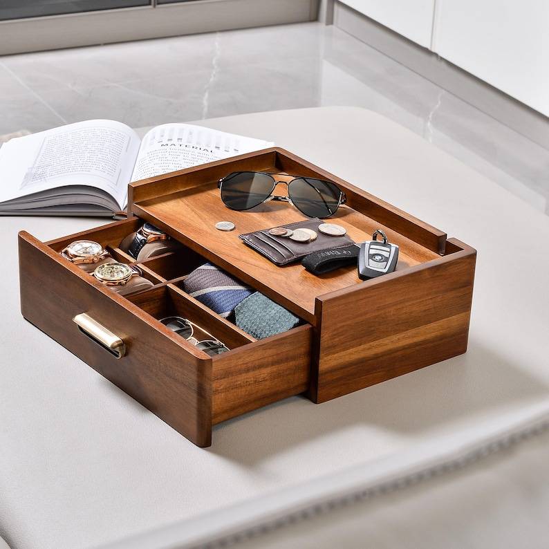 Custom Engraved Wooden Valet Tray Single Drawer Organizer Docking Station for Men Phone Watch Holder Bedroom Office Living Room