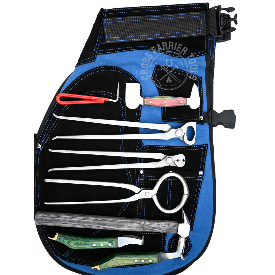 Custom Farrier Tools Kit with Leather Apron Stainless Hoof Knife Loop Puller Tester Nipper Hammer Nail Clincher Brush Combo